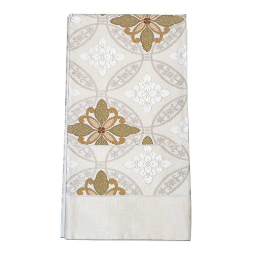 | 商品の特徴 | 銀色ベースの上品な袋帯です。 道長取りの中に七宝模様とおめでたい柄、 フォーマルな装い、留袖から色無地までお使いいただけます。 |