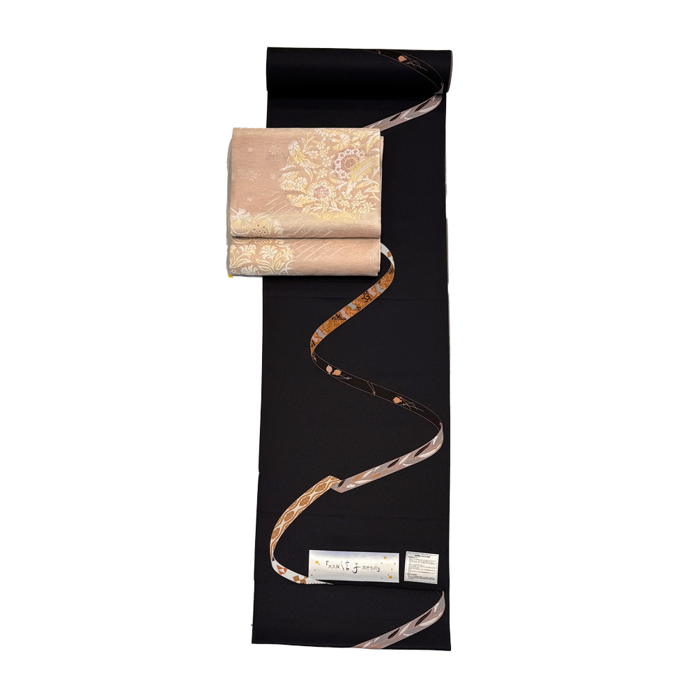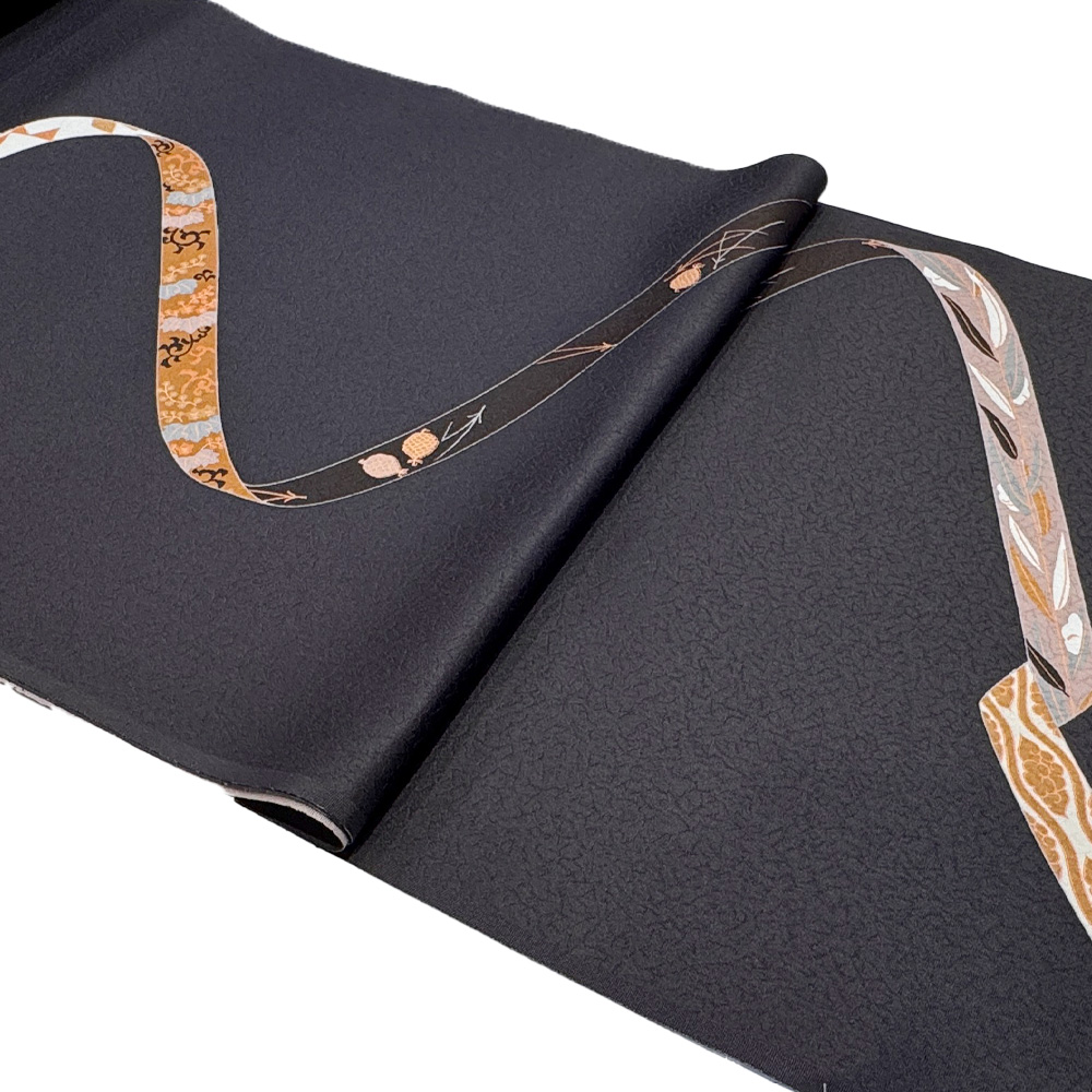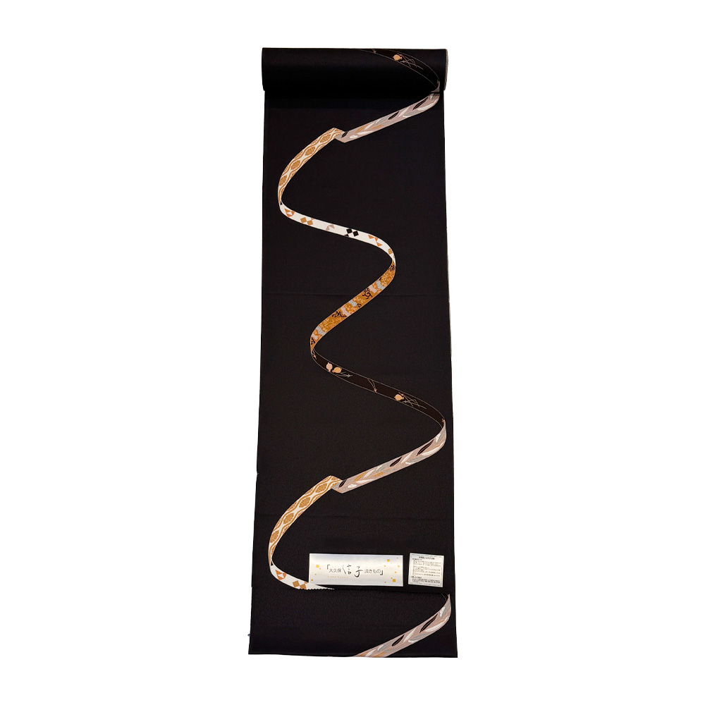 商品の特徴 | きものスタイリスト・大久保信子さん監修の東レシルック小紋。深い黒地に滑らかな地紋が浮かび、流れるような帯文様がモダンで印象的なデザインです。オレンジや金彩を効かせた品のある配色は、シンプルながら華やかさも演出。高級感ある仕上がりながら、東レのシルック素材で自宅での手洗いも可能。しわになりにくく、気軽に着られる点も魅力です。観劇・お食事会・お稽古などのセミフォーマルな場面にふさわしい一枚です。 |