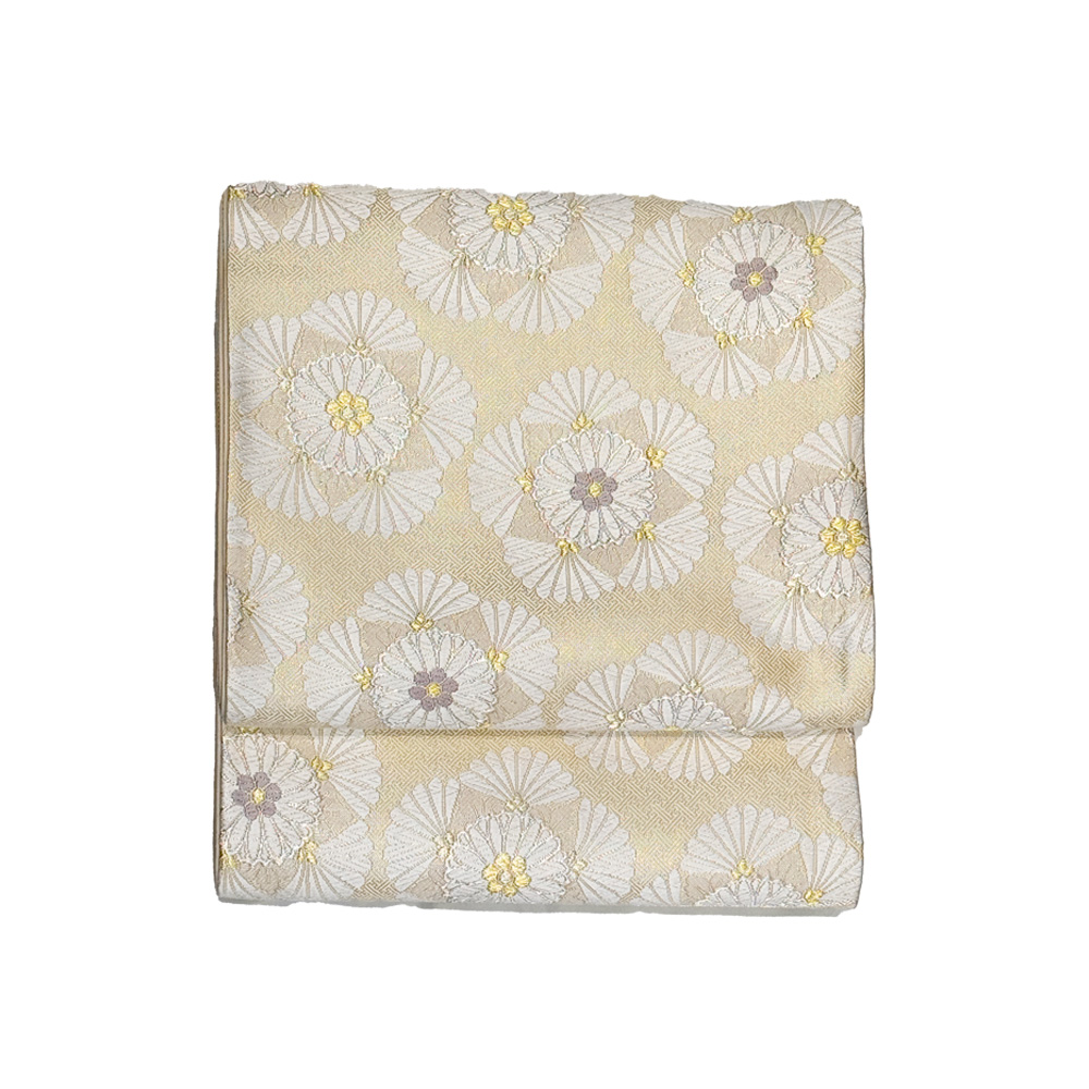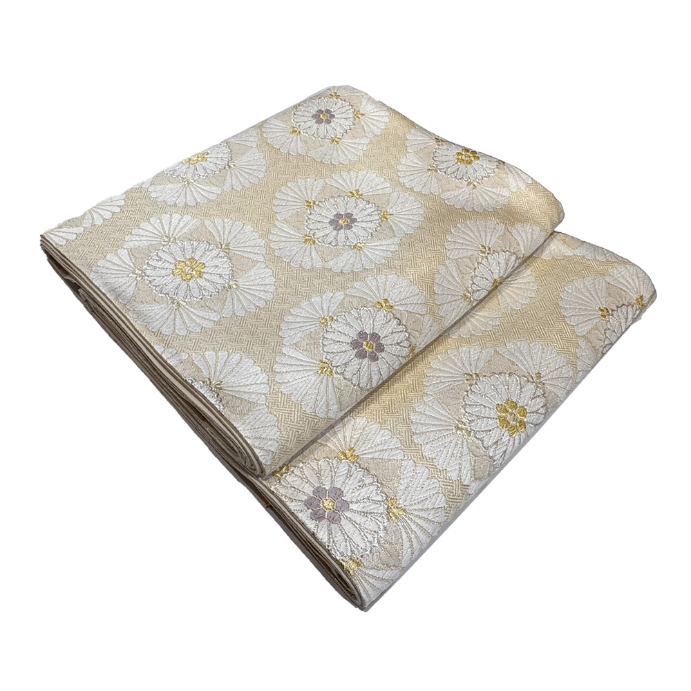 商品の特徴 | 華やかな菊花が一面に織り出された、西陣織の高級袋帯です。アイボリー地に白と金を基調とした配色が気品を感じさせ、格調高い装いを演出します。繊細な織技により文様が立体的に浮かび上がり、訪問着や附下、色無地などとの相性も抜群。季節を問わず着用できる意匠で、結婚式・お宮参り・卒入学式など晴れの日の装いに最適です。しっかりとした帯地で締めやすく、格式と実用性を兼ね備えた一本として長くご愛用いただけます。 |