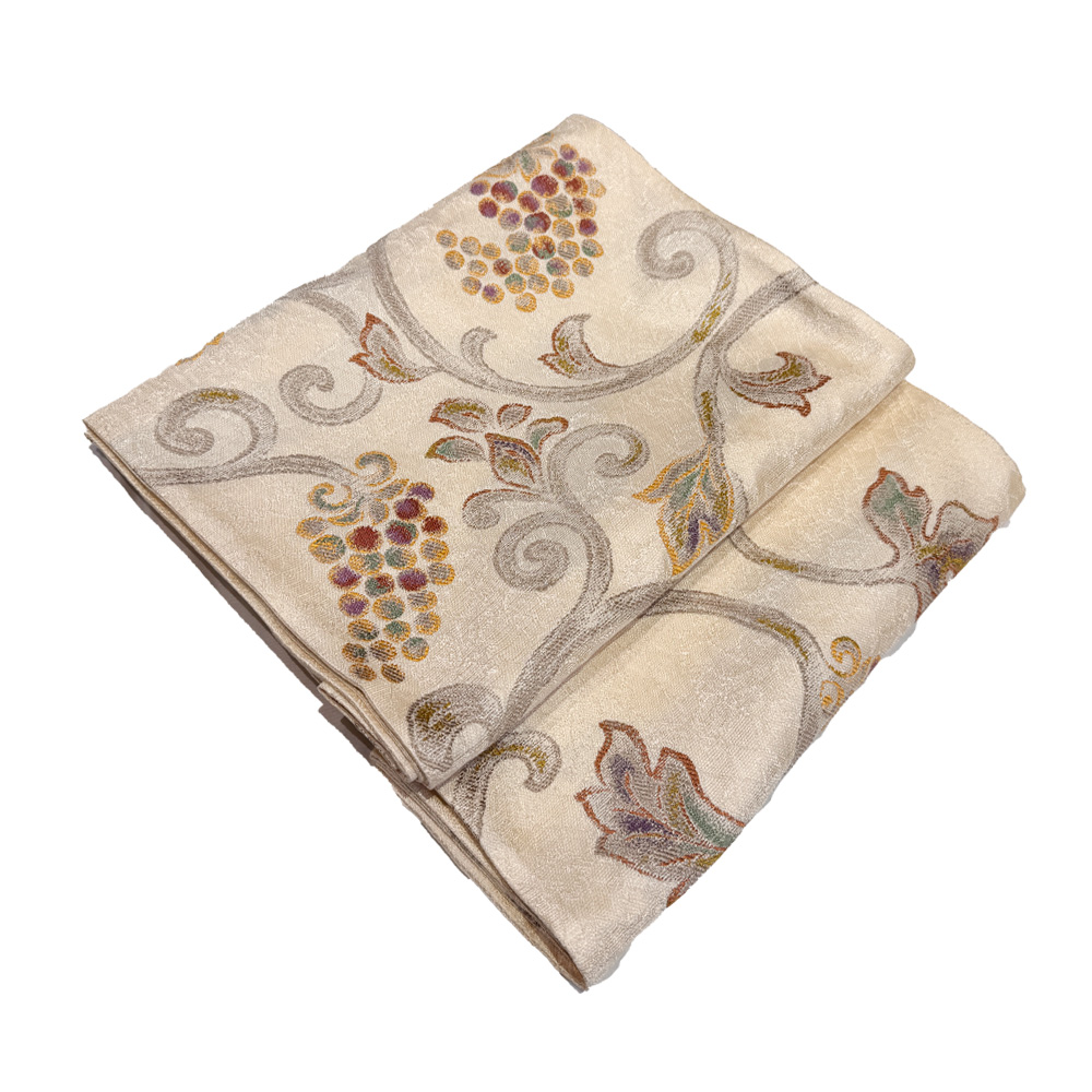 商品の特徴 | 優美なぶどう唐草文様があしらわれた、西陣織の袋帯です。やわらかなアイボリー系の地色に、繊細な多色の糸で表現された実や葉が映え、落ち着いた中にも華やぎを感じさせます。なめらかな手触りとほどよい張り感で、締めやすさも抜群。訪問着・附下・色無地など幅広い装いに合わせやすく、パーティーや式典、お茶席にもおすすめです。季節を問わずご着用いただけるデザインで、着姿を上品に彩る一条のアクセントとなる一本です。帯の名門、都謹製 |