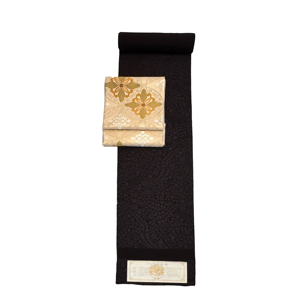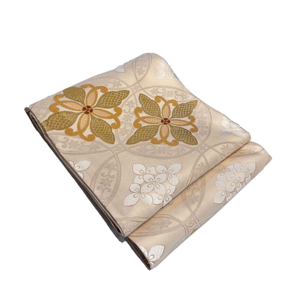商品の特徴 | 気品ある光沢と重厚感を備えた、西陣織の高級袋帯です。やわらかなベージュ地に、大きく配された花唐草文様が華やかさを添え、格調高い印象に。繊細な織りの技術により柄が立体的に浮かび上がり、訪問着や色無地、附下などフォーマルな装いにふさわしい一本です。お祝いの席や式典、あらたまったお席に、上質な装いを演出してくれます。西陣ならではの織の美を、ぜひご堪能ください。 |