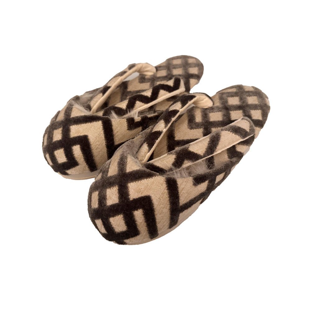 | 商品の特徴 | こちらは「防寒草履(格子文様・ファー付き)」です。 ベージュ地に大胆なグレーの格子柄を配した、モダンで存在感のあるデザイン。竹皮を丁寧に編み上げた素材は、軽くて通気性が良く、丈夫で長くご愛用いただけます。内側にはふんわりとしたファーをあしらい、冷えやすい冬の足元をやさしく包み込みます。外履き用のしっかりとした底で滑りにくく、街歩きやお稽古などにも最適。着物姿はもちろん、洋服にもよく馴染む和モダンな一足です。寒い季節のお出かけを上品に彩る、実用的でおしゃれな冬草履です。 |