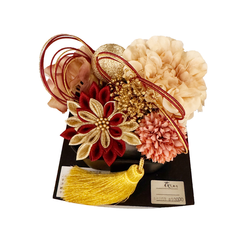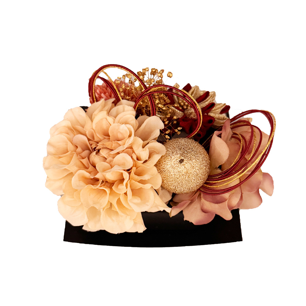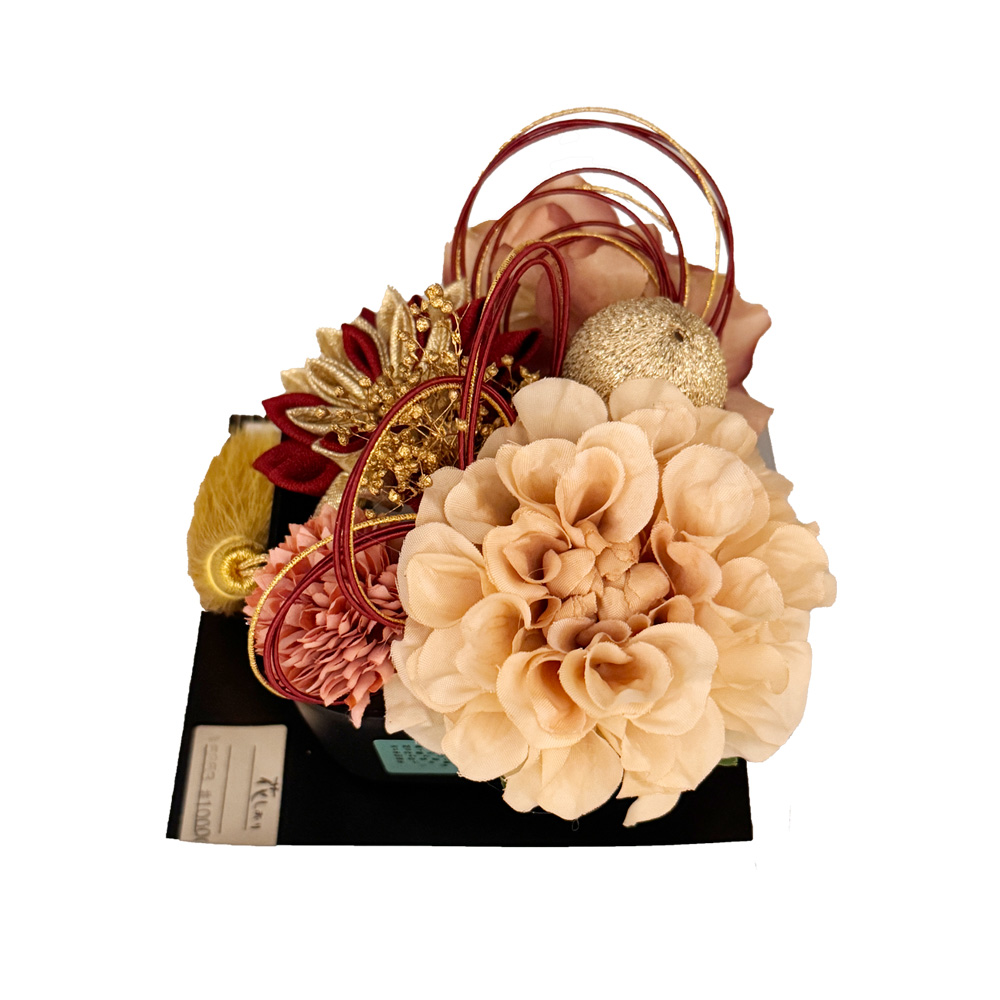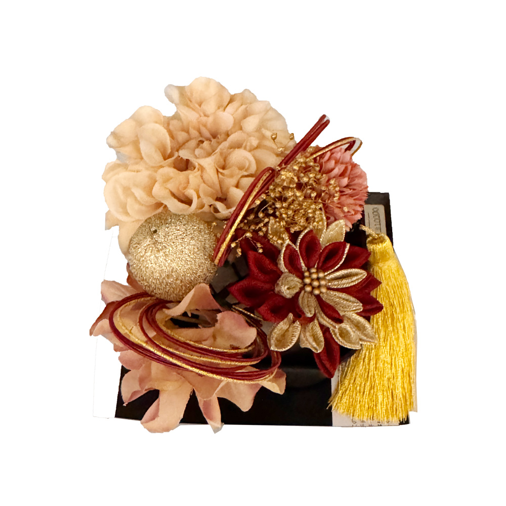| 商品の特徴 | こちらは「成人式用 髪飾り(つまみ細工×フラワーアレンジ)」です。 深みのあるえんじ色のつまみ細工を中心に、ベージュやピンク系の花々をバランスよくあしらった上品で華やかな髪飾り。金糸のタッセルと水引飾りが加わることで、成人式の振袖姿にふさわしい格調と華やかさを演出します。花びらの立体感と光沢が美しく、後ろ姿まで華やかに彩ります。成人式はもちろん、卒業式や結婚式などの晴れの日にもおすすめ。和装をより美しく引き立てる、高級感ある一点です。 |